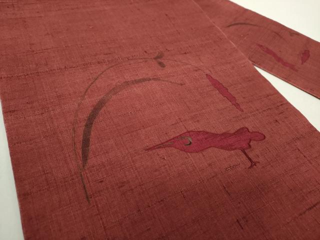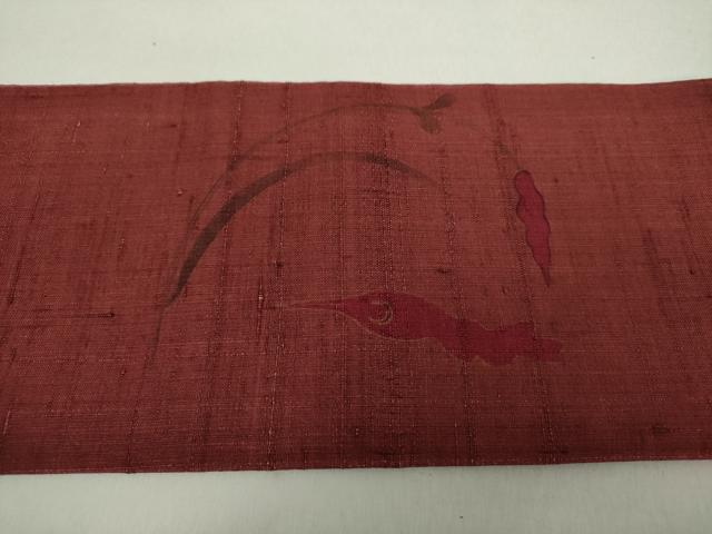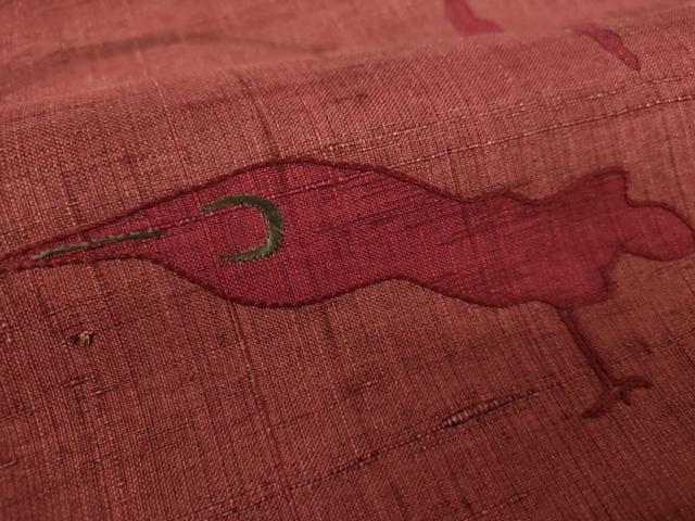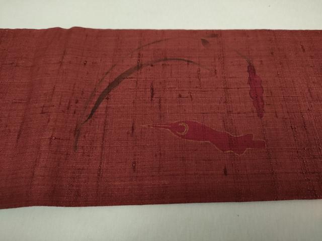 Heiwaya Kimono: 9-inch Nagoya Obi (Sash), Raw Tsumugi Silk, Hand-Painted Embroidery, Flower and Bird Design, Pure Silk, Excellent Item, DABA1344ps