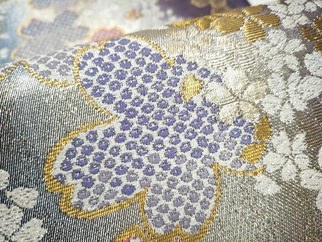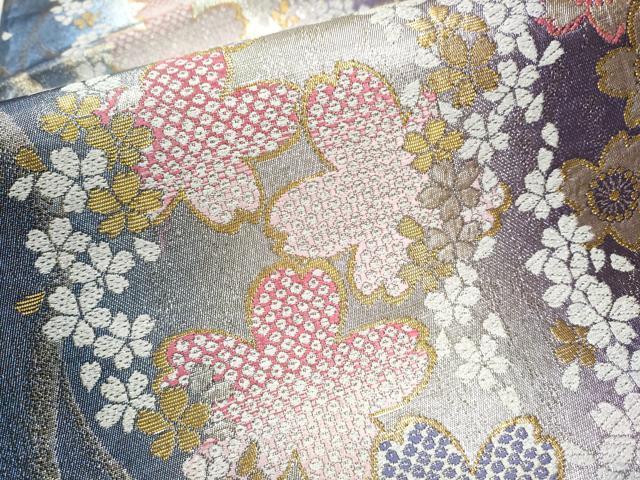 Heiwa-ya Kimono: Six-way Pattern Fukuro Obi with Dancing Cherry Blossom Design, Gold and Silver Thread, Pure Silk, Excellent Quality, CAAY2711hy