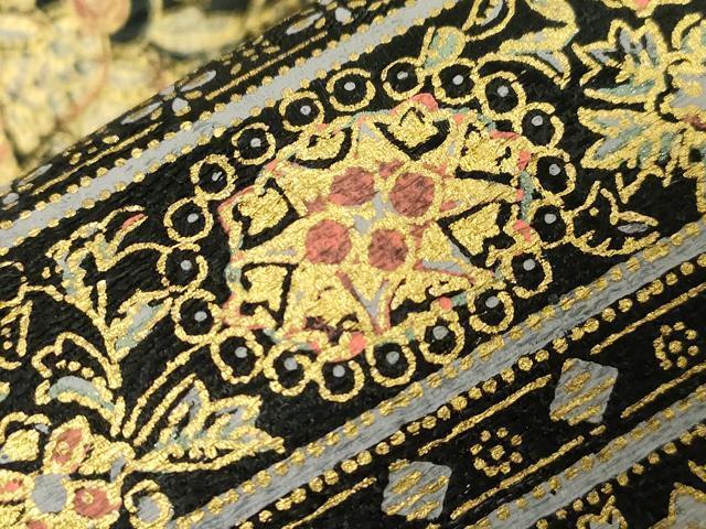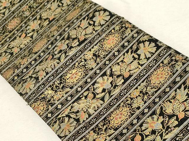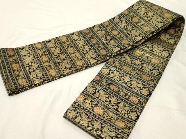 Heiwaya Kimono: Half-width Obi (Sash), Tsumugi Pongee, Chinza Flower and Bird Design, Black with Gold Accents, Pure Silk, Excellent Condition, Unused, CABA9116dy