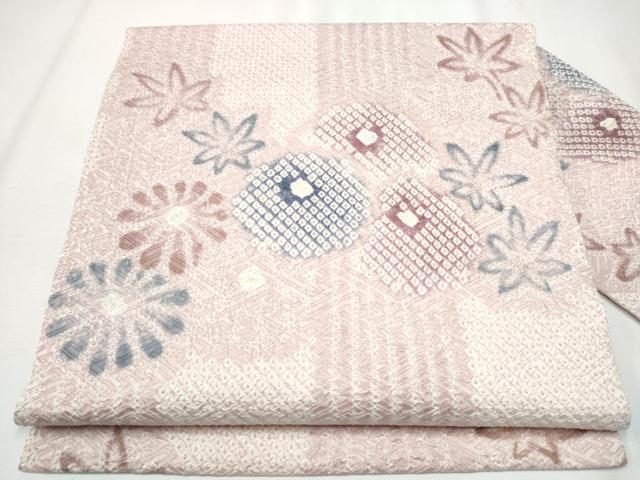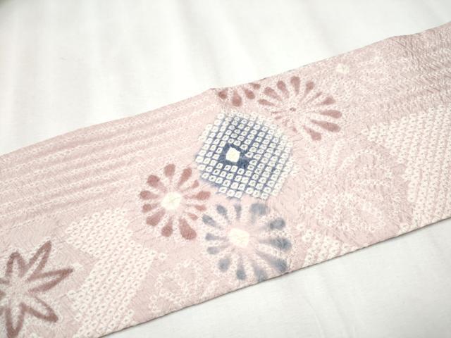 Heiwa-ya Kimono: Fujimusume Kinutaya, a prestigious 9-inch Nagoya obi with a full tie-dye pattern and a Maihana (flower) design. This exquisite piece is made of pure silk. Product code: CABA4861hy