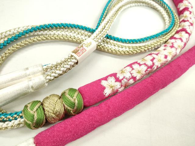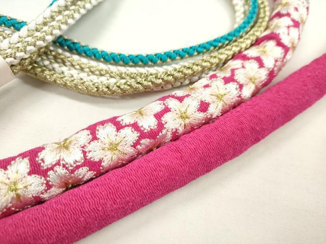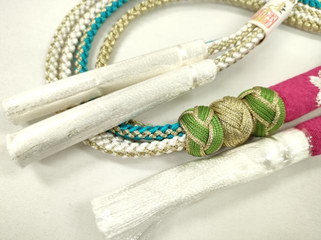 Heiwaya Kimono: Japanese Accessories, Furisode Obi-jime (Sash Band), Round-shaped, Embroidered, Small Cherry Blossom Design, Odamaki, Gold Thread, Unused, CABA9383ju