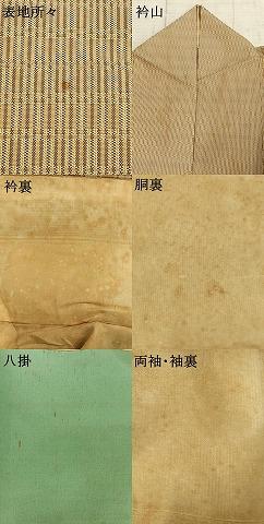 状態は接写画像のように表地所々・衿山・衿裏・胴裏・八掛・両袖袖裏に薄い汚れがございます。