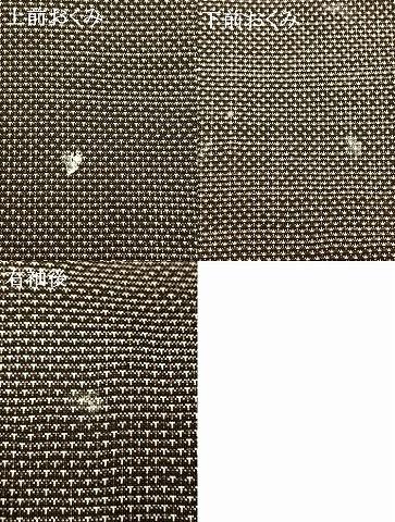 状態は接写画像のように上前おくみ・下前おくみ・右袖後に薄い汚れがございますが
