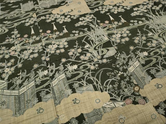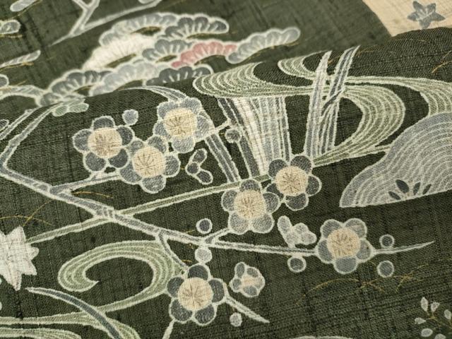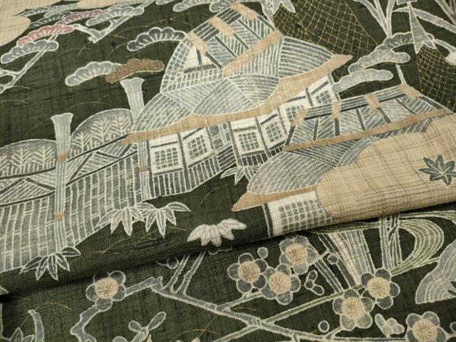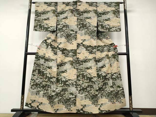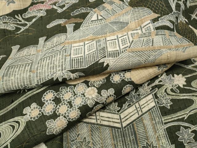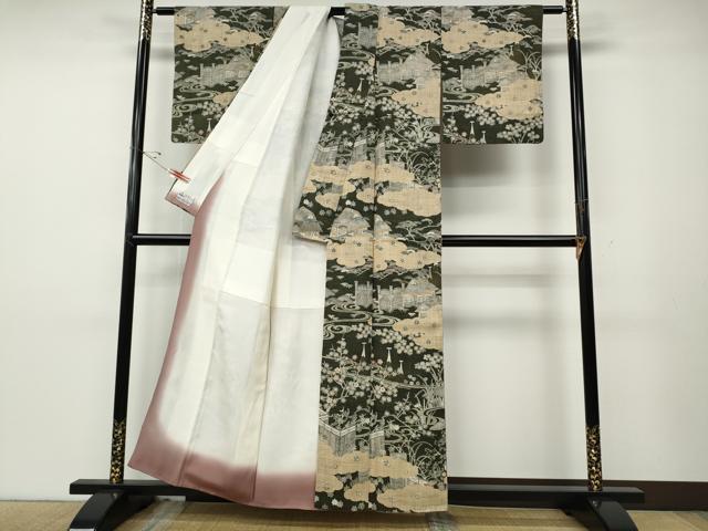 Heiwaya Kimono ● Prestigious dyeing and weaving house, Shozan. Raw silk kimono with cloud and landscape floral pattern. Made in Yamato. Pure silk. A masterpiece. CABD7500ut