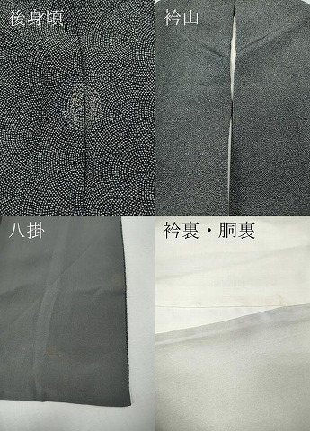 状態は接写画像のように後身頃・衿山・両袖口・衿裏・胴裏・八掛に薄い汚れがございますが