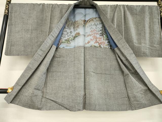 Heiwaya Kimono: Men's Tsumugi Ensemble, Solid Color, Smoke-Colored, King Size, Pure Silk, Excellent Condition, AABD1112ck