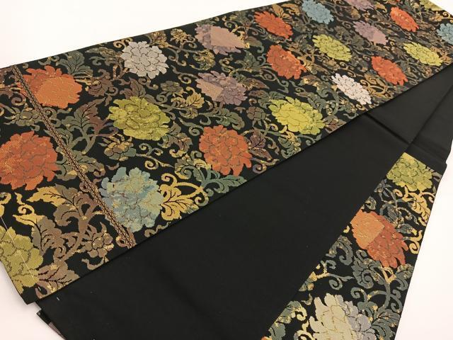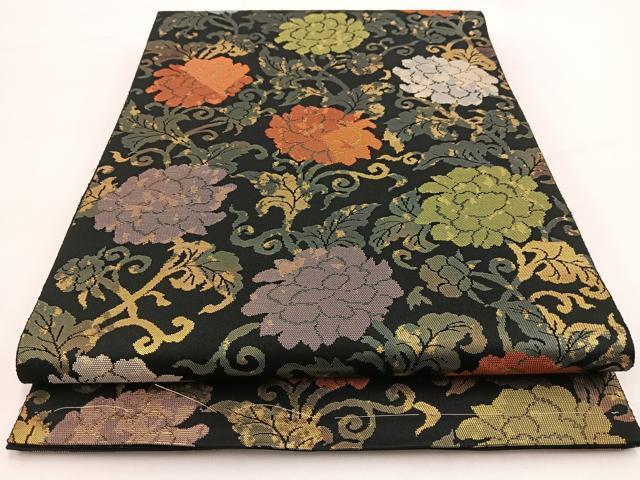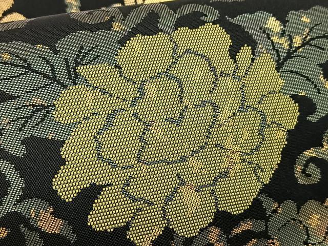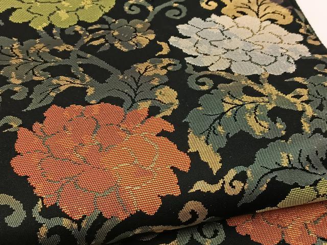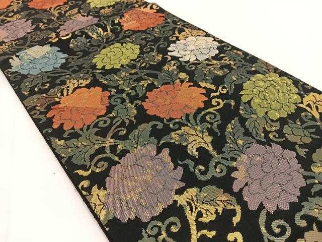 Heiwaya Kimono: Nishijin, Hattori Orimono, Six-Pass Pattern Obi, Amber Brocade, Peony Arabesque Design, Black Background, Gold Thread, Pulled Leaf, Pure Silk, Excellent Item, BAAV7470yc
