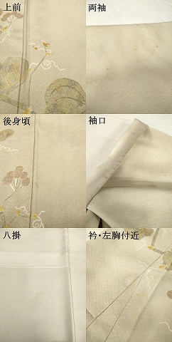 状態は接写画像のように上前・両袖・後身頃・八掛・衿・左胸付近にシミ、袖口に薄い汚れがございますが