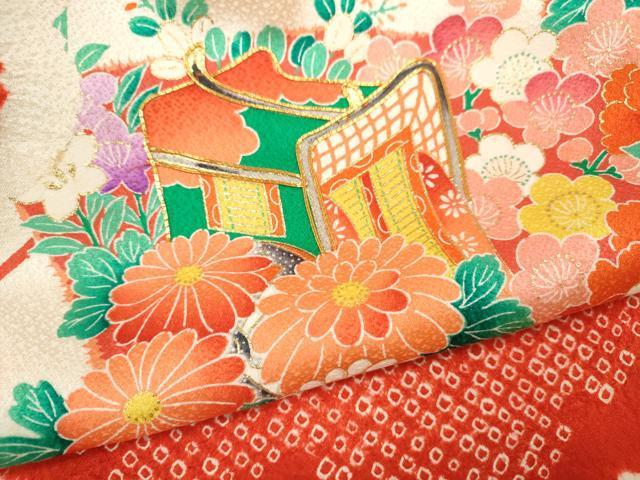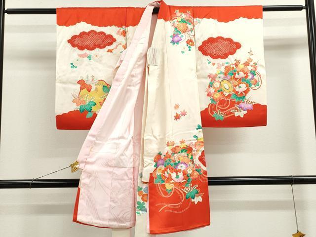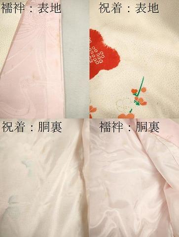 産着【表地:正絹・胴裏:化繊、襦袢:化繊・一つ紋】の状態は接写画像のように祝着と襦袢の表地所々・胴裏所々に薄い汚れがございます。