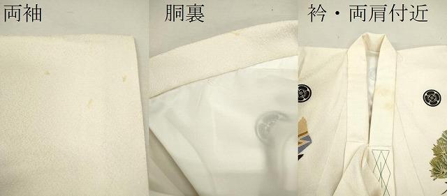 産着【表地:正絹・胴裏:化繊・五つ紋】の状態は接写画像のように両袖・胴裏・衿・両肩付近に薄い汚れがございます。