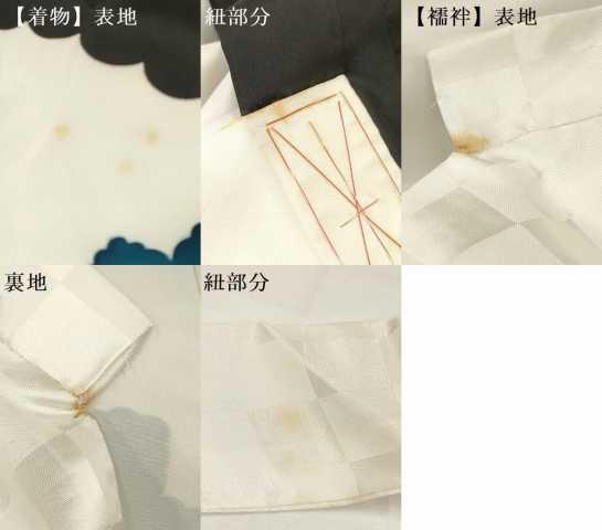 着物:表地所々・紐部分、襦袢:表地所々・裏地・紐部分に薄い汚れがございます。