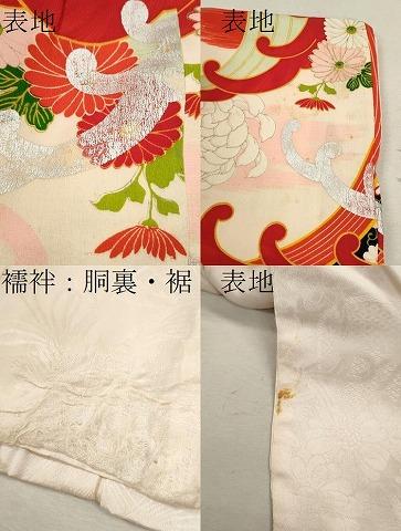 着物【正絹】の状態は接写画像のように表地所々に箔の剥がれ・薄い汚れ、胴裏・襦袢の胴裏・表地所々に薄い汚れ、