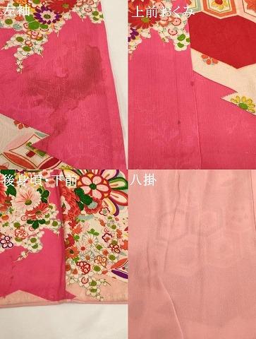 着物【正絹】の状態は接写画像のように左袖・上前おくみ・後身頃・下前・八掛に汚れがございますが