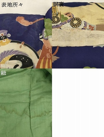 着物【正絹】の状態は接写画像のように表地所々・胴裏・紐に汚れがございます。