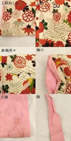 着物【正絹】の状態は接写画像のように上前おくみ・上前に破れ、表地所々・袖口・八掛・紐に汚れがございます。