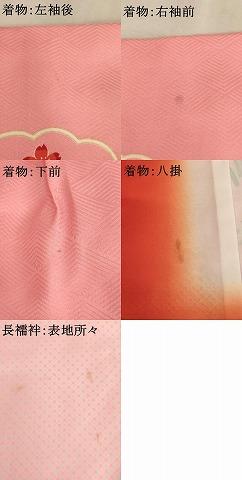 着物【正絹】の状態は接写画像のように左袖後に薄い汚れ、右袖前・八掛に汚れ、下前に点汚れがございますが