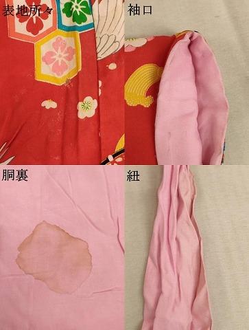 着物【交織】の状態は接写画像のように表地所々に穴・汚れ、袖口・胴裏・紐に汚れがございます。