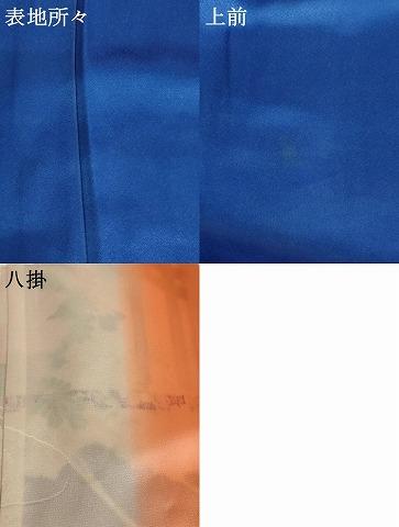 着物【化繊】の状態は接写画像のように表地所々にヤケ、上前に汚れ、八掛に色移りがございます。