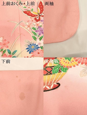 着物【正絹】の状態は接写画像のように上前おくみ・上前・両袖・下前・後身頃に汚れがございますが