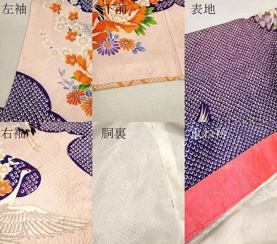 着物【正絹】の状態は接写画像のように左袖・胴裏・重ね衿に薄い汚れ、下前・右袖に色移り、表地にヤケがございます。
