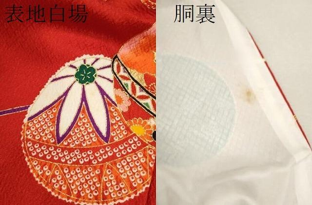 着物【化繊】の状態は接写画像のように表地白場に薄いシミ、胴裏に薄い汚れがございます。
