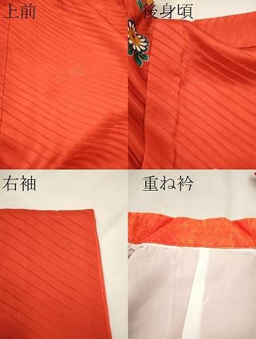 着物【表地:正絹・胴裏:化繊】の状態は接写画像のように上前・後身頃・胴裏・右袖・重ね衿に薄い汚れがございますが