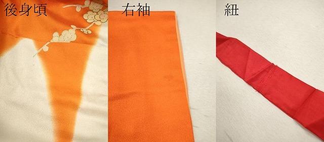 着物【表地:正絹・胴裏:化繊】の状態は接写画像のように後身頃・右袖に薄い汚れ、紐に接ぎがございますが
