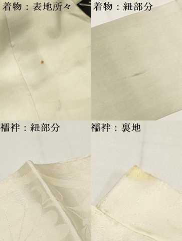 着物:表地所々・紐部分、襦袢:紐部分・裏地に薄い汚れがございます。