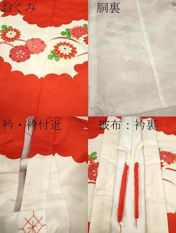 着物【表地:正絹・胴裏:化繊・五つ紋】の状態は接写画像のようにおくみ・衿・衿付近・胴裏に薄い汚れがございますが