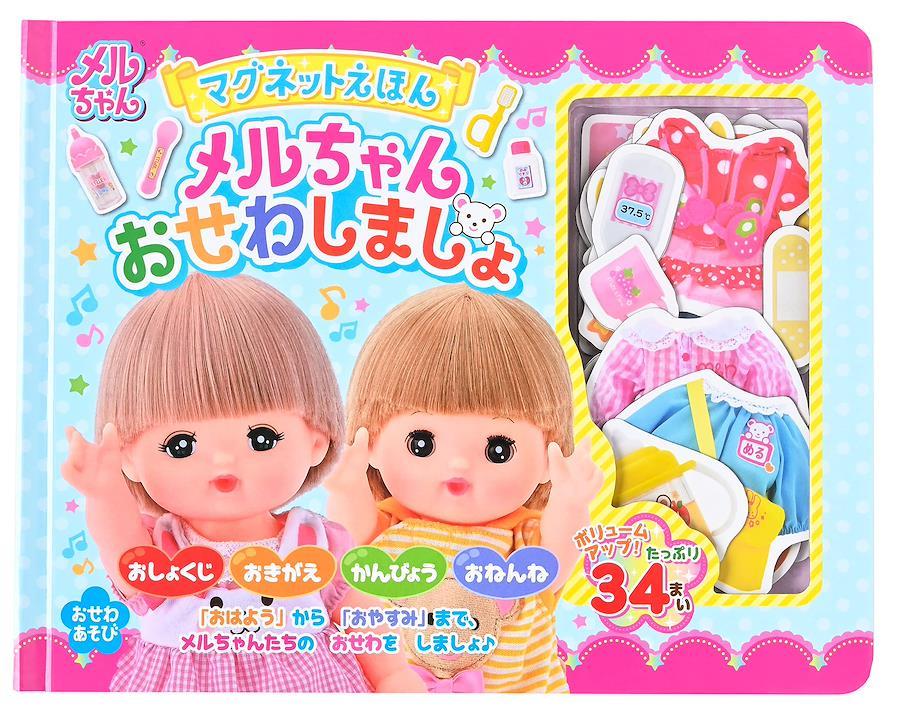 「おはよう」から「おやすみ」まで、メルちゃんたちのお世話をしましょ!パイロットコーポレーションのお世話人形「メルちゃん」のマグネット絵本です。「おしょくじ」「おきがえ」「かんびょう」「おねんね」の4つのシーンで、いろいろなお世話遊びが楽しめます。マグネットは、たべもの・ようふく・おくすりなど全部で34枚。お皿の上にたべものを置いて食事をしたり、ようふくを着せたり、ばんそうこうやおくすりで手当てや看病をしてあげたり、歯みがきをしてお布団に入るといった就寝準備をしたりなど、すきなところにマグネットを貼って遊びます。監修:株式会社パイロットコーポレーション (C)PILOT Corporation「メルちゃん」は、株式会社パイロットコーポレーションの登録商標です。[セット内容]絵本8ページ(4場面)・マグネット34枚 (C)PILOT Corporation, GENTOSHA 2023