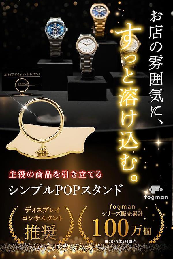 「限られたスペースで活躍」 fogmanのPOPスタンドは、商品の下に土台を置く設計で、狭いショーケースや限られた売り場スペースでも無駄なく活用できます。