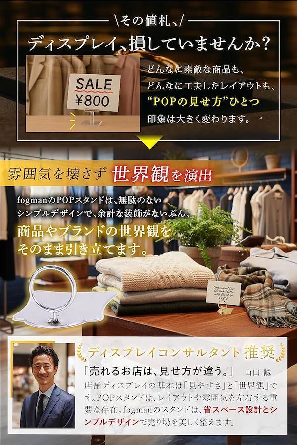 「限られたスペースで活躍」 fogmanのPOPスタンドは、商品の下に土台を置く設計で、狭いショーケースや限られた売り場スペースでも無駄なく活用できます。