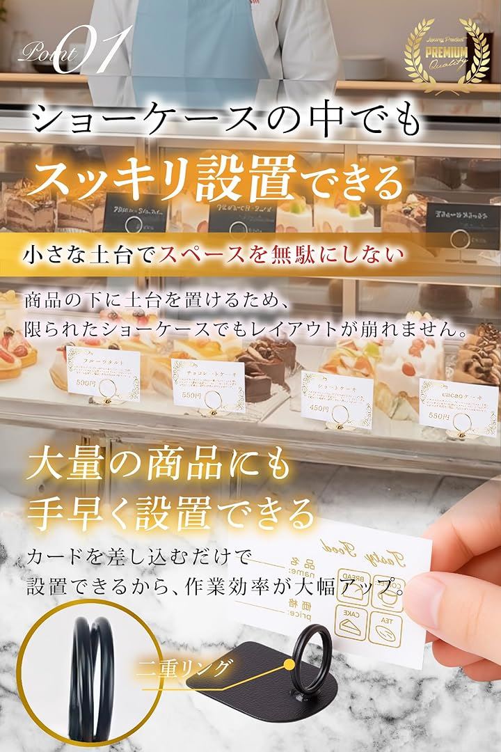 「限られたスペースで活躍」 fogmanのPOPスタンドは、商品の下に土台を置く設計で、狭いショーケースや限られた売り場スペースでも無駄なく活用できます。