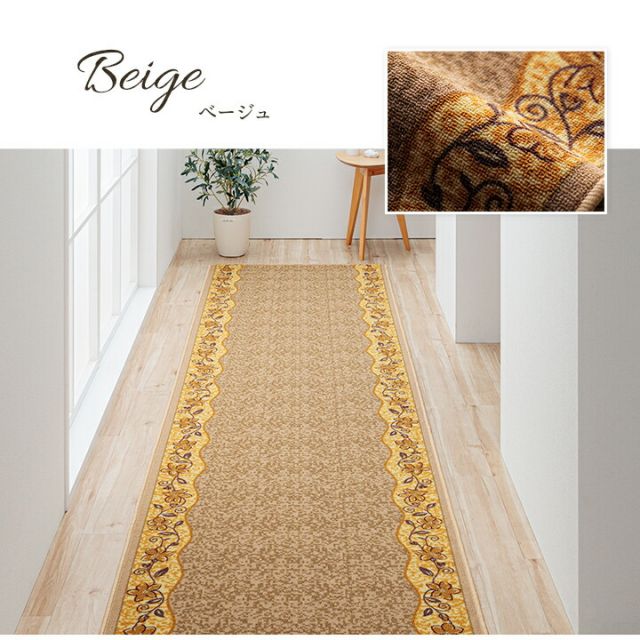 クラシカルな印象の上品な商品です。廊下敷きとしても、キッチンマットとしてもご使用頂けます。表地には丈夫で汚れにくいナイロンを使用しているため耐久性にも優れた商品です。裏面にはすべりにくい加工を施しています。