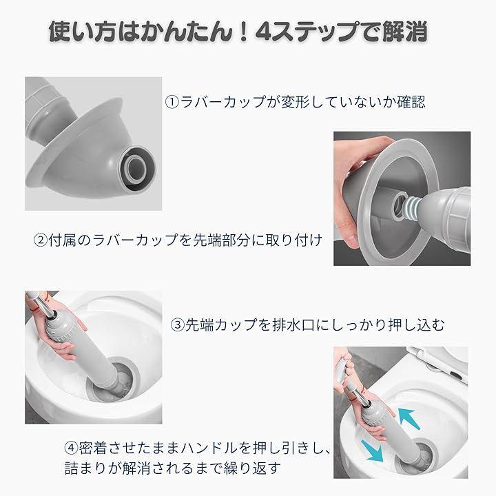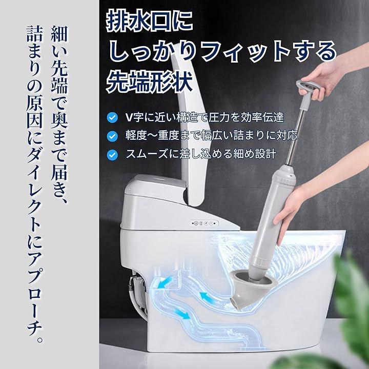 「使用のポイント」(初心者でも簡単)・便器の排水口部分にしっかり先端を密着させる ・先端が完全に隠れる程度の水位を確保する ・ハンドルをまっすぐ引き、圧力をかける ・数回繰り返すと水位が正常に戻り、流れが改善されます ・短時間で効果が現れやすく、緊急時にも頼りになる1本です