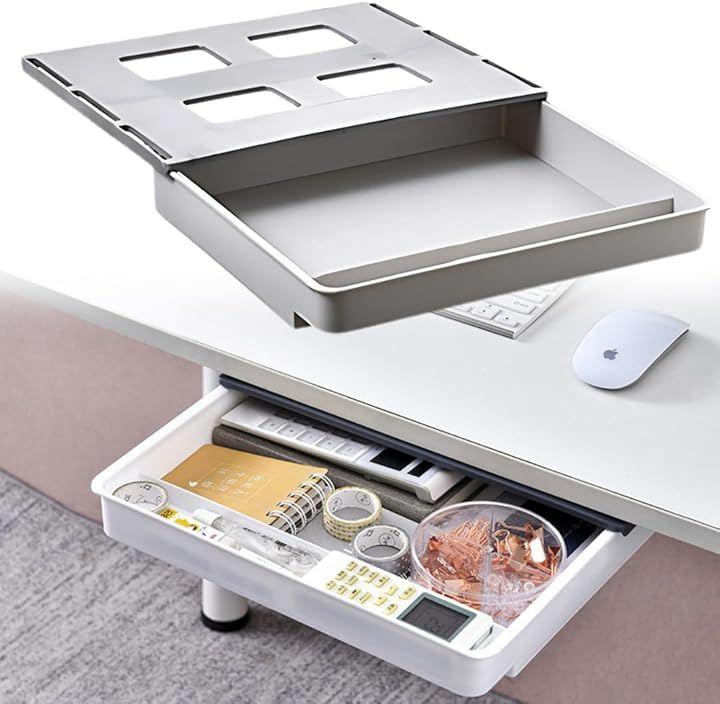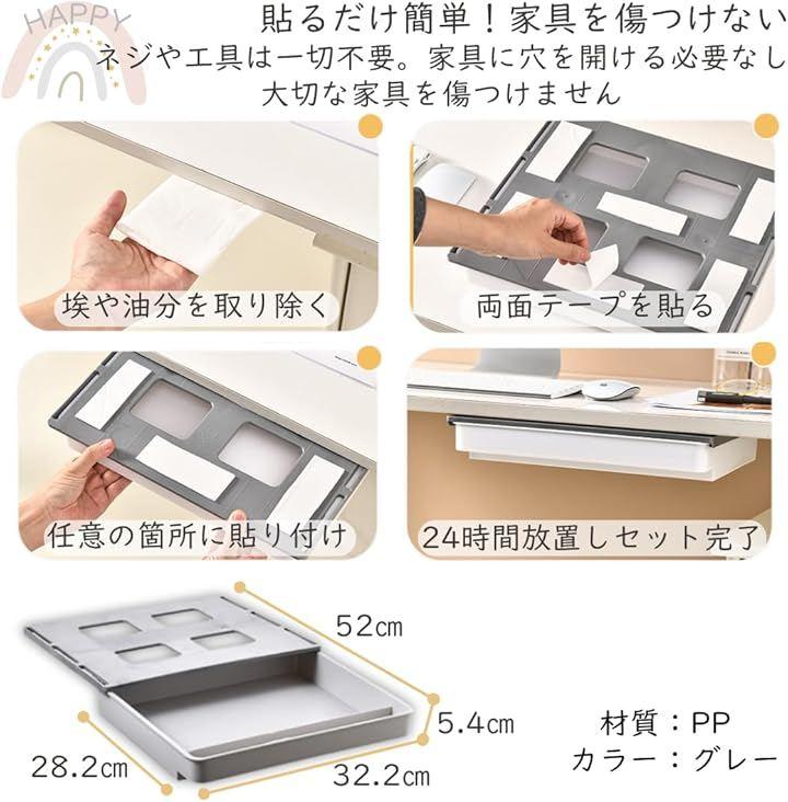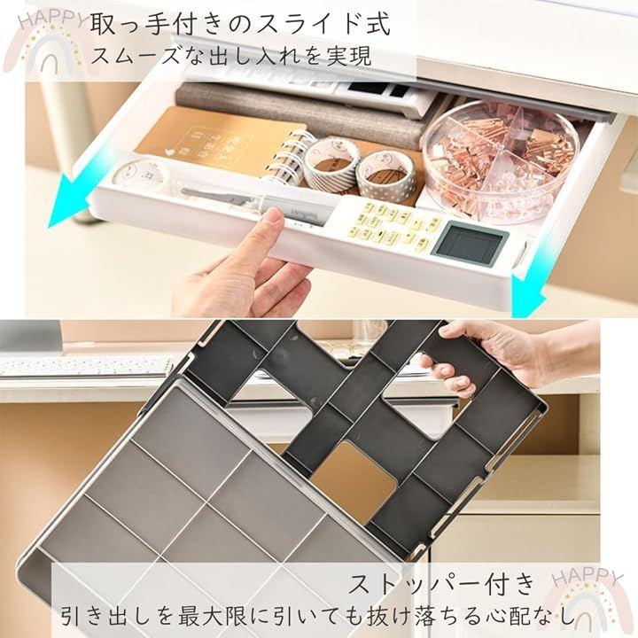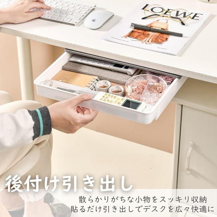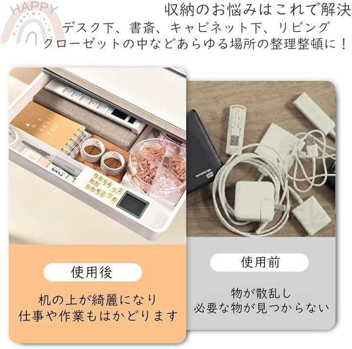 「驚きの収納力でデスク周りをスッキリ。」デスク下、書斎、キャビネット下、リビング、クローゼットの中など、あらゆる場所に設置可能。引き出しがない場所に後付けできる便利な収納グッズです。