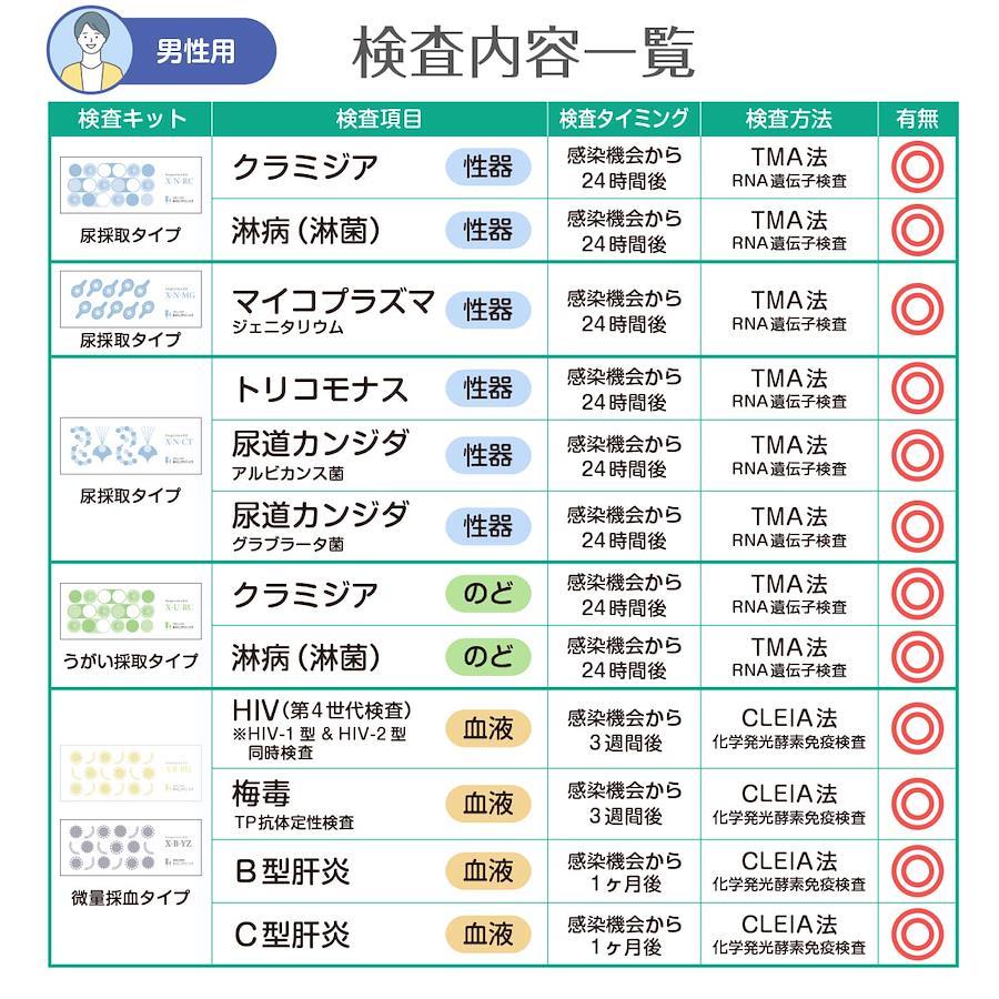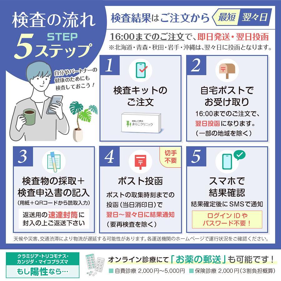郵送検査キット 男性用:喉と性器感染の 淋菌(淋病) クラミジア、性器感染の マイコプラズマ ジェニタリウム 尿道カンジダ2種(アルビカンス菌 グラブラータ菌) 尿道トリコモナス、梅毒 HIV(エイズ)B型肝炎 C型肝炎 を、うがい 尿 血液 で検査。 16時までのご注文で即日発送。検査結果はご注文から最短翌々日。 匿名の性病検査キット。プライバシーに配慮した無地箱で自宅ポストにお届け。 シンプルな申込みで、スマホのショートメッセージへ結果通知。 土日祝日 年末年始 お盆休み GW も「発送 検査 結果通知」を行っております。