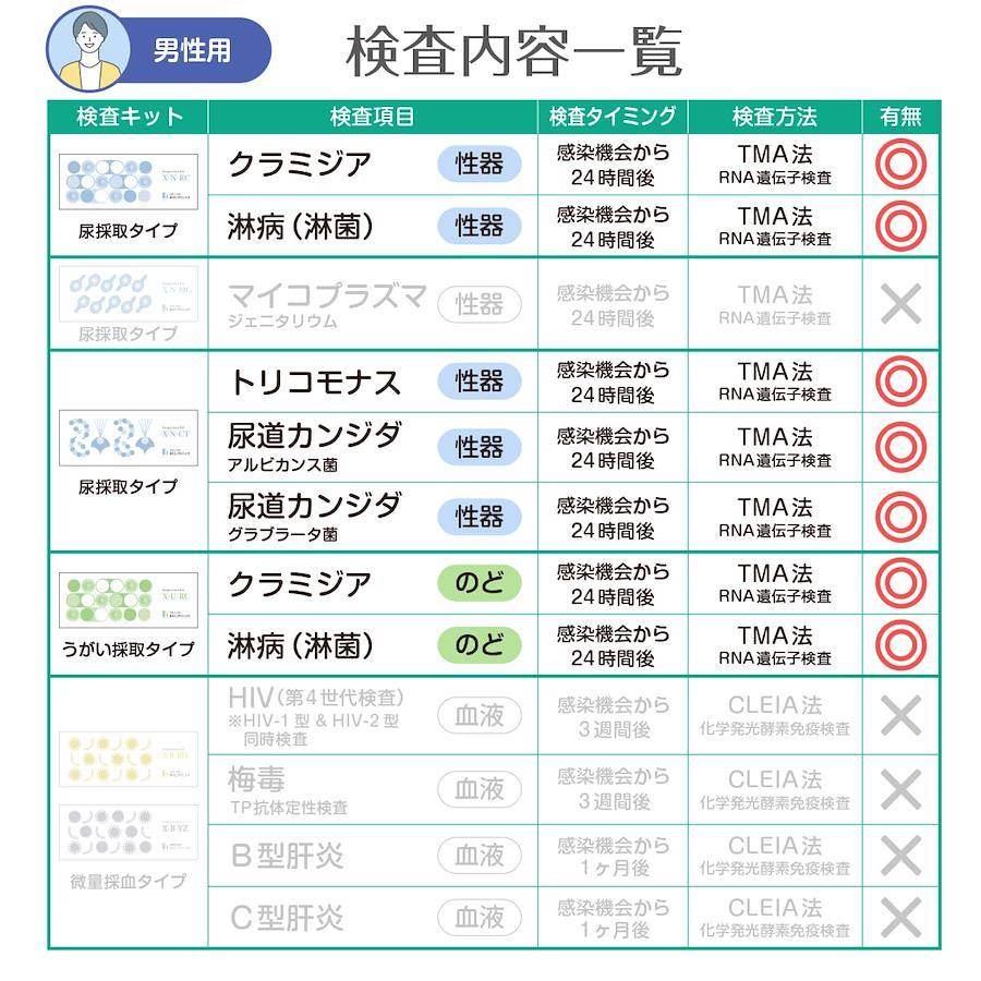 郵送検査キット 男性用:喉と性器感染の 淋菌(淋病) クラミジア、性器感染の 尿道カンジダ2種(アルビカンス菌 グラブラータ菌) 尿道トリコモナス を、うがい 尿 で検査。 16時までのご注文で即日発送。検査結果はご注文から最短翌々日。 匿名の性病検査キット。プライバシーに配慮した無地箱で自宅ポストにお届け。 シンプルな申込みで、スマホのショートメッセージへ結果通知。 土日祝日 年末年始 お盆休み GW も「発送 検査 結果通知」を行っております。