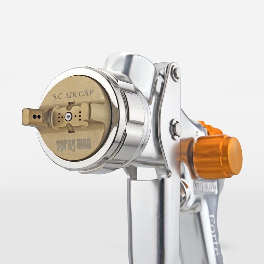 恵宏製作所独自のS.C低圧高微粒化空気キャップをForte専用に新たに設計しました。低圧でも霧化効率が高く、微粒化した塗料が効率よく塗着します。低圧で塗料の跳ね返りがすくないので、環境への負荷や作業者の暴露も軽減されます。手に自然と馴染むラウンドボディ形状を新たに採用しています。スプレーマンの作業負担を軽減し、作業の効率化を図れます。
