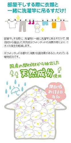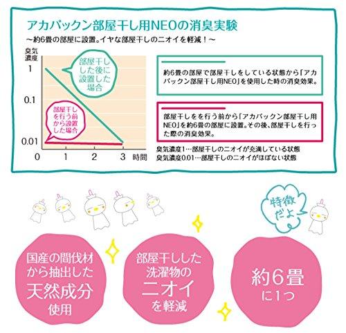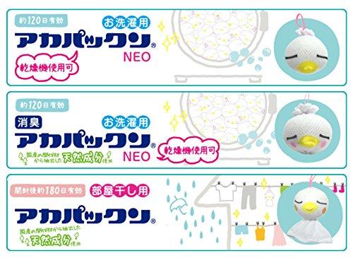 部屋干しする際に、洗濯物と一緒に洗濯竿に吊るすだけでニオイの発生を軽減させる天然成分フィトンチッドの消臭作用により、優れた消臭・抗菌効果が得られるイヤなニオイをとる「アカパックン洗濯用消臭」と、皮脂汚れを吸着する「アカパックン洗濯用NEO」と併用すればニオイの抑制、汚れも軽減出来る使用は約6畳に1個の目安