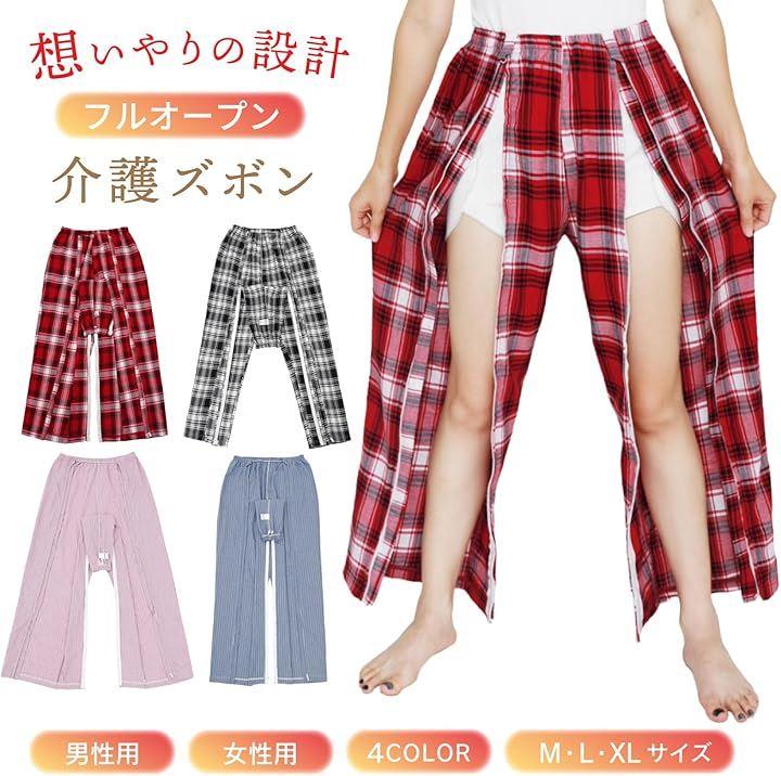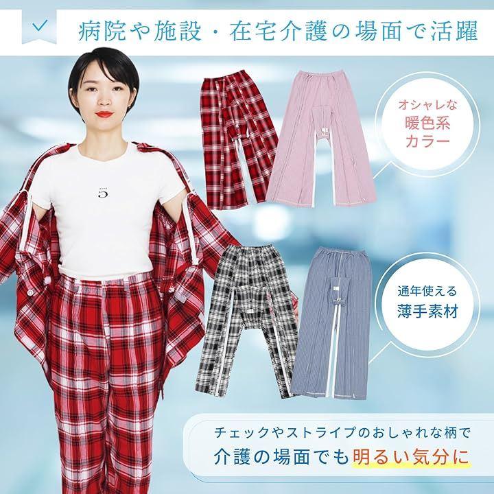 チェックやストライプのおしゃれな柄で、女性用の暖色系カラーはかわいい印象もあり、介護の場面でも明るい気分に。