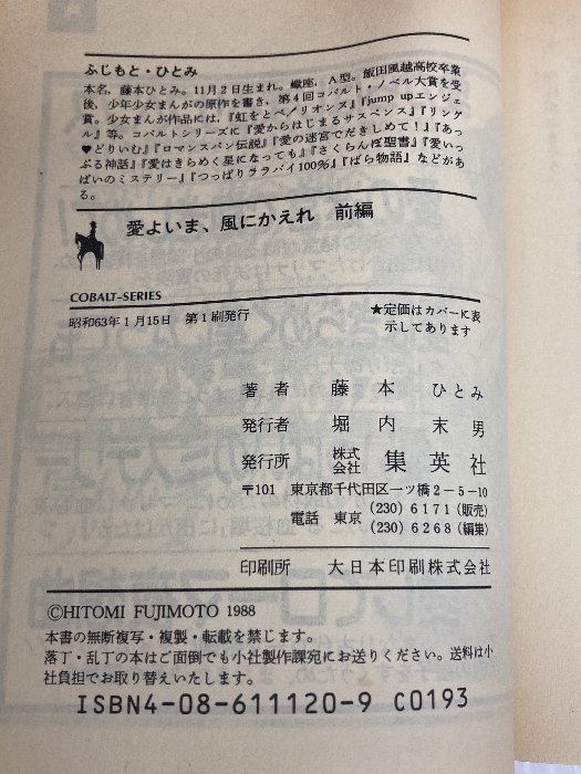 ■商品詳細■ 商品名・愛よいま、風にかえれ(前) まんが家マリナ黒鈴事件 (まんが家マリナシリーズ) (コバルト文庫) 集英社 藤本 ひとみ/ ■商品状態■表紙にスレ、ヤケ、キズ、天地小口に強いヤケ、スレ、キズ、シミ、本に反り、歪み、カバーにヨレ、があります。本を読むことに支障はございません。※注意事項※■毎商品チェック後出品しておりますが、中古品ということもあり、多少の書き込み等のチェック漏れがあった際はご容赦下さい。■付録等の付属品がある商品の場合、記載されていない物は『付属なし』とご理解下さい。■併売販売をしているため、在庫切れの場合はキャンセルとなります。予めご了承ください。