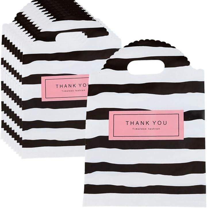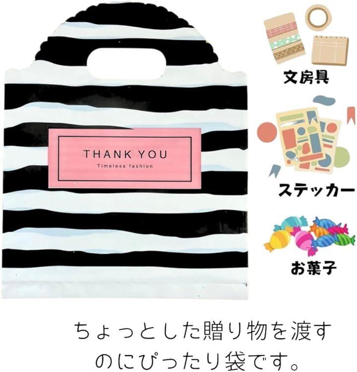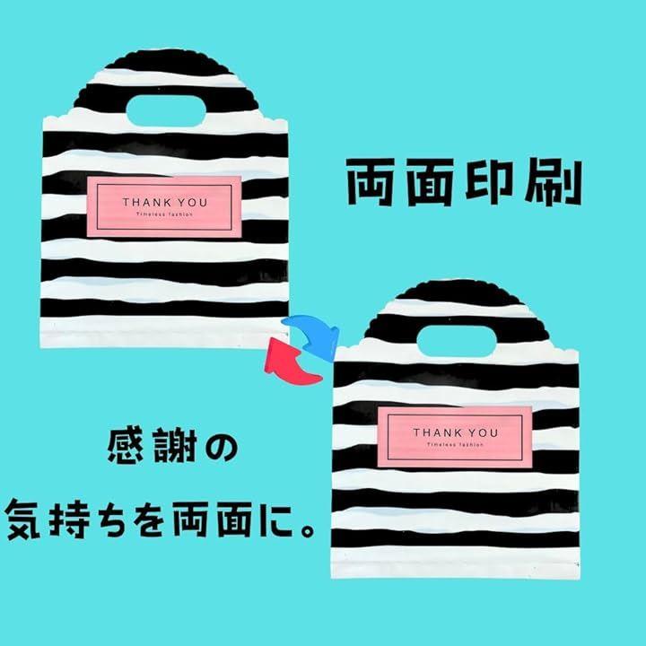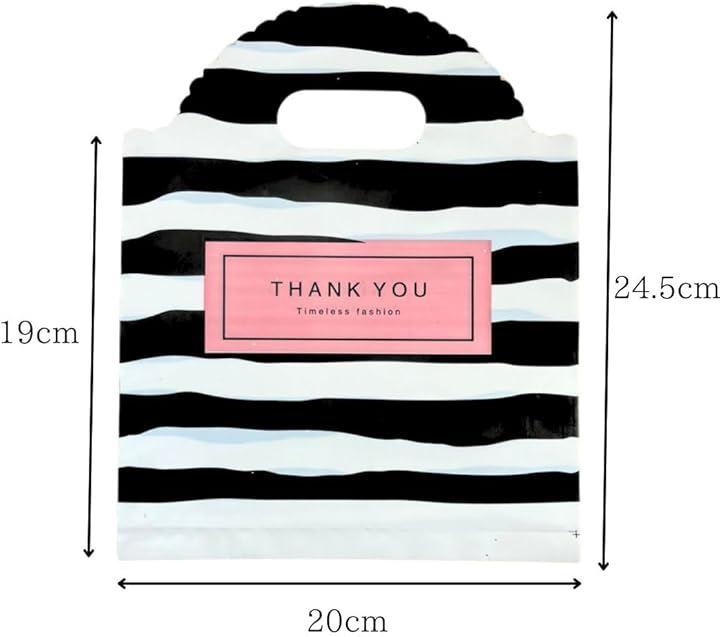 「ありがとう」のメッセージが印象的な、ブラックとホワイトのストライプ柄が特徴の高品質ビニール袋です。