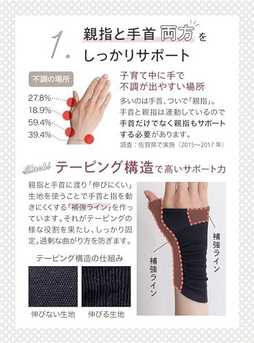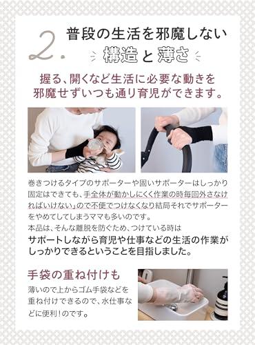 長時間使用する場合は適度な着脱を繰り返してください。 適用サイズの範囲外の方は着用しないでください。捻挫・骨折等外傷直後の方は使わないでください。装着部位に傷・腫物・発疹等の異常がある方は使用しないでください。 使用中・使用後に発疹・かぶれ・うっ血・痛みが発生した場合は、ただちに着用を中止してください。就寝中は使用しないでください。 「ほつれ」の原因となりますので、爪や鋭利なもので引っ掛けないでください。 サイズ(手のひらの一番広いところの周囲):Mサイズ;16-22cm Lサイズ:18-24cm LLサイズ:20-26cm ・サイズに関して:着用した際に、ちょっときつい、小さいかもと心配になる方は布を伸ばしたり、男性など手の大きな人につけてもらうとすこし生地が伸びてこなれてきます。それでもつけているのが辛い方はサイズアップしたり使用を一時中止してください。「楽になる」という実感が一番の適切な状態です。 ・適切なサイズ感:■着圧感が気持ちいい ■親指部分がフィットしている ・サイズがあっていない:■つけているのが辛いくらいきつい ■親指部分がぶかぶか