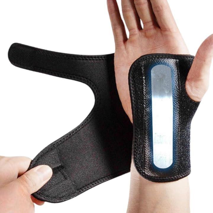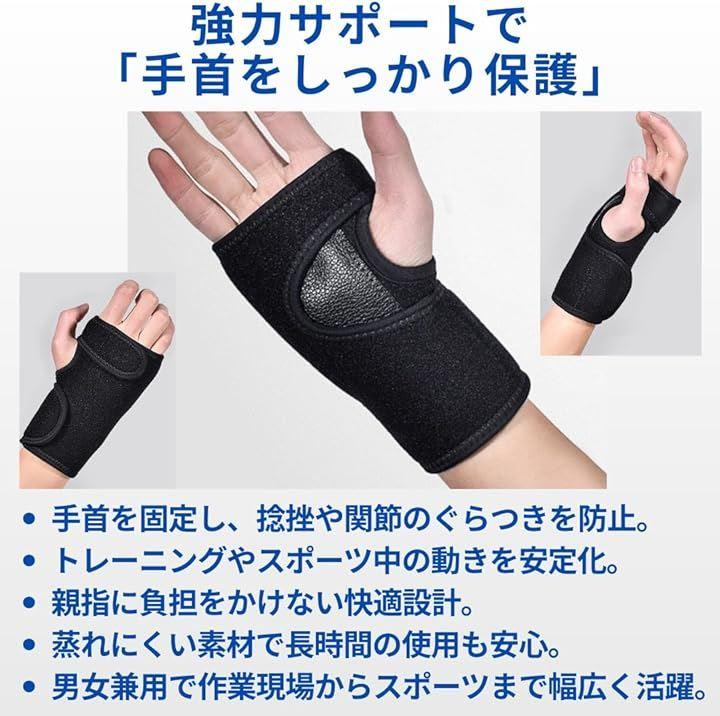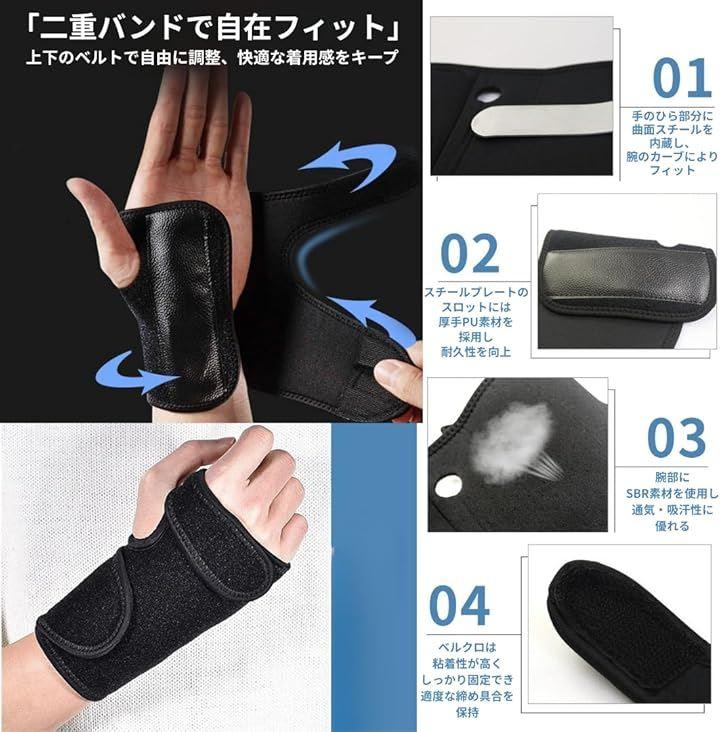 「金属プレート入りで安定サポート」手のひら側に軽量プレートを内蔵し、手首の動きを制限して安定性を高めます。