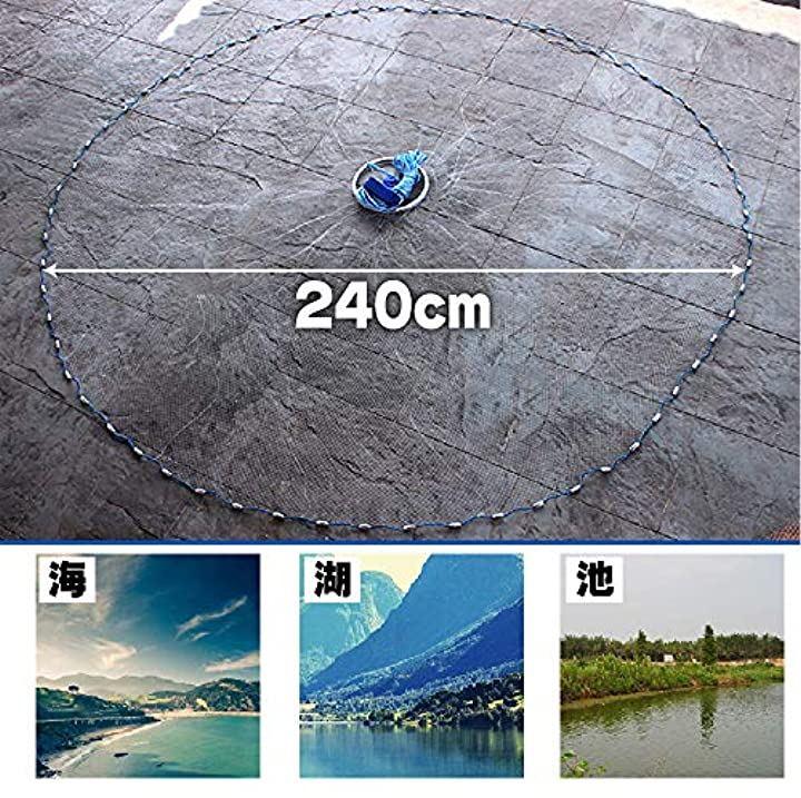 投網サイズ 約2.4m、素材 ナイロン、手縄サイズ 約12m、素材 ナイロン、アシスタントリング 直径約28cm、素材 アルミニウム合金、重量 約1700g、パケージ内容 投網、投げ方マニュアル*モニターの環境により、色の見え方に若干差が生じる場合がございます。