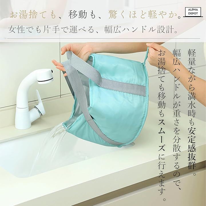 「持ち運びしやすい取手付きで快適に使える」柔らかい持ち手がついており、たっぷりのお湯を入れても女性一人で簡単に持ち運び可能。