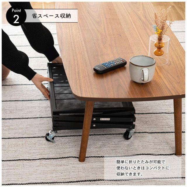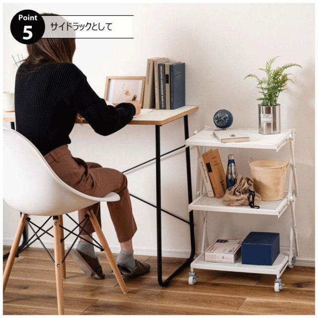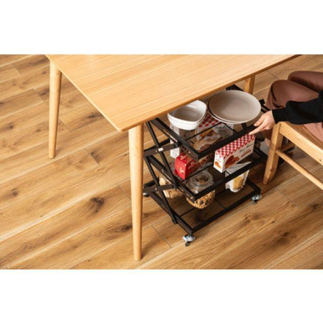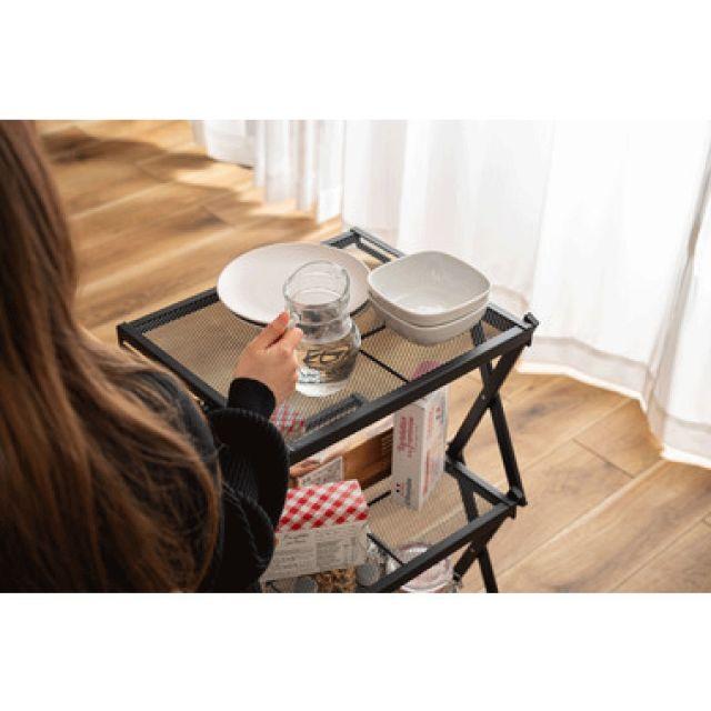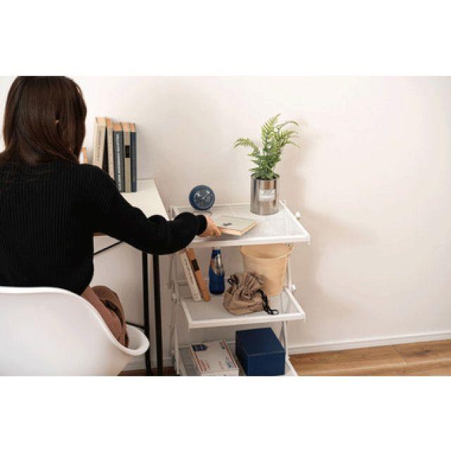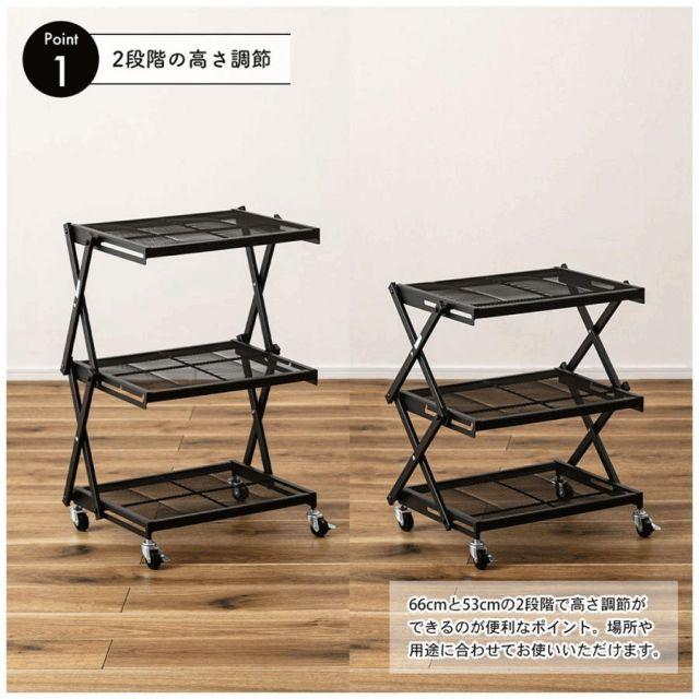 ●すっきりとしたシンプルデザインのフォールディングラック。●2段階の高さ調整が可能で、使わない時は折りたたんで省スペースに収納。●移動がしやすいキャスター付きなので様々な場所で活躍。●53cmと66cmの2段階で高さ調整ができるのが便利なポイント。●場所や用途に合わせて使えます。●簡単に折りたたみが可能で、使わない時はコンパクトに収納。●キャスター付きで移動も楽々。ストッパーも付いているので固定も可能。●キッチンワゴンとして。●デスク横のサイドラックとして。〈製品規格〉商品サイズ:W45×D34×H53/66cm商品重量:約4.5kg静的耐荷重:5kg材質:スチール(粉体塗装)組立:完成品機能:簡単折りたたみ式/2段階高さ調整生産国:中国