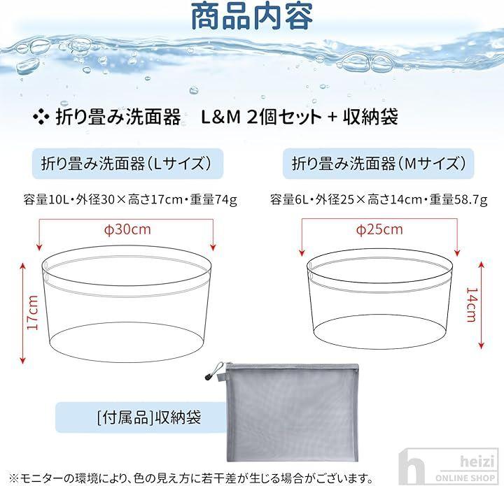 「商品内容」折り畳み洗面器 Lx1個、Mx1個(計2個)+収納袋 サイズ:[Lサイズ] 容量10L、外径30x高さ17cm、重量74g [Mサイズ] 容量6L 外径25x高さ14cm、重量58.7g [収納袋]23.5x17.2cm(A5サイズ) *モニターの環境により、色の見え方に若干差が生じる場合がございます。