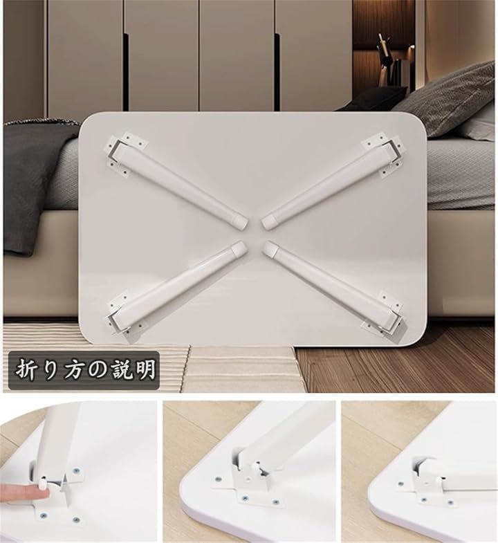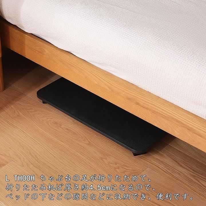 「折りたたみ式」:L THOOH ちゃぶ台の足が折りたためて、折りたたみ机ば厚さ約4.5cmになるので、ベッドの下などの隙間などに収納でき、便利です。